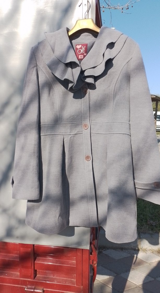 Gri renkte, uzun kollu ve volanlı yakaya sahip bir kaban. Önden düğmeli ve belden hafifçe genişleyen kesimi bulunur. ️
