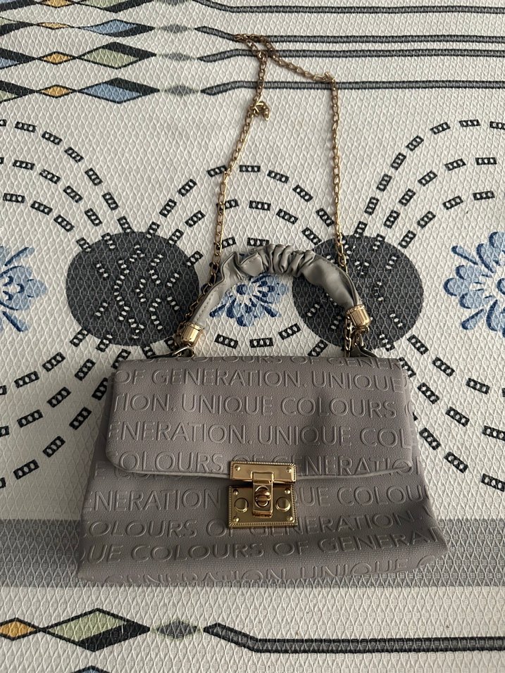 , zincir detaylı kadın çantası. Sentetik kumaştan üretilmiş, kabartmalı desenli ve altın renkli toka ile günlük kullanıma uygun.