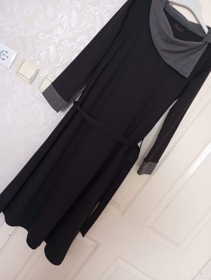 Gri ve siyah renkte, uzun kollu, bol kesim ve drapeli yüksek yakalı , Yumuşak sentetik kumaştan, günlük kullanım için uygundur.