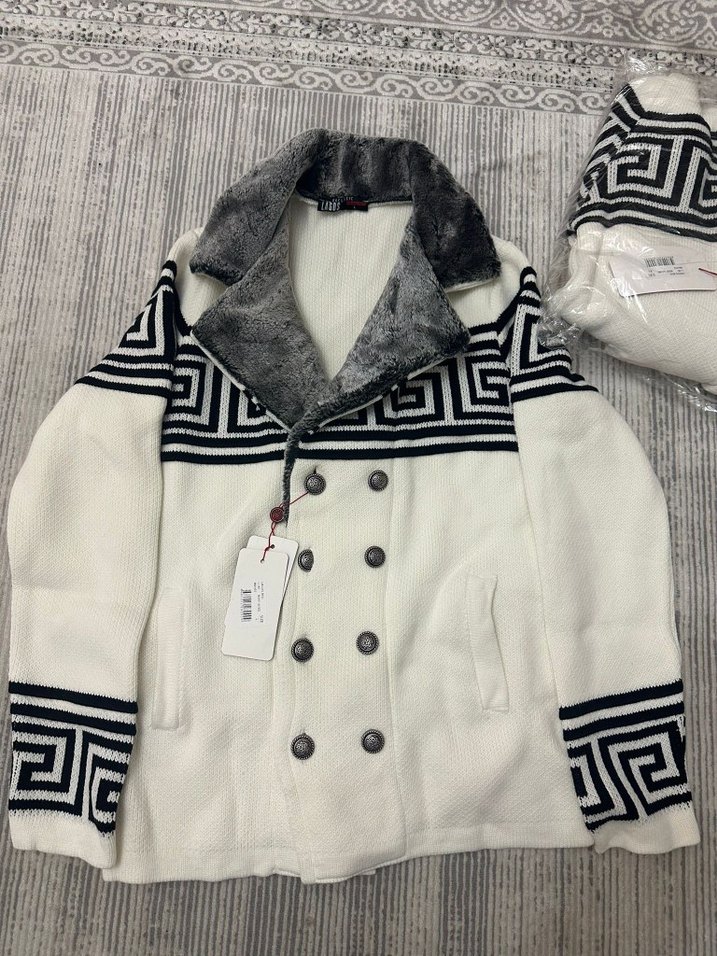 Gri Yakalı Baskılı Beyaz Örgü Erkek Ceket