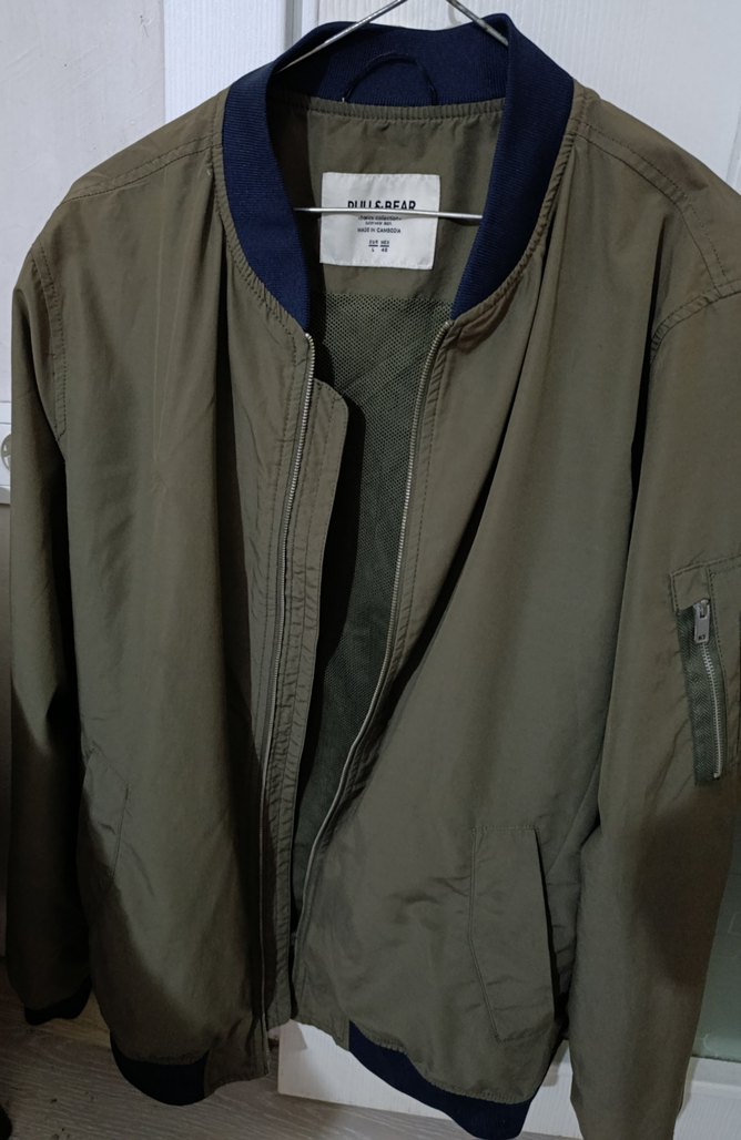Erkekler için bol kesim, uzun kollu, fermuarlı ve yakalı hırka. Yumuşak sentetik kumaştan, günlük kullanıma uygun haki renkte.