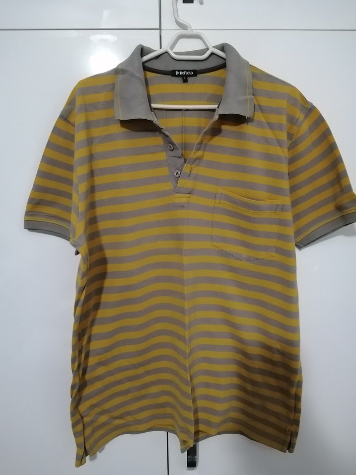 Kısa kollu, düğmeli yakalı ve cep detaylı, sarı ve gri çizgili erkek polo tişört. Rahat kesimi ve yumuşak sentetik kumaşıyla günlük kullanıma uygundur.