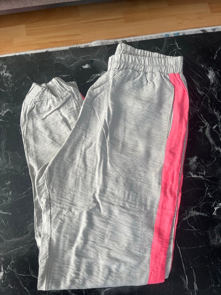 Gri sentetik kumaştan, yanları pembe şeritli, lastikli bel ve bol kesime sahip kadın eşofmanı. Spor ve günlük kullanıma uygundur.