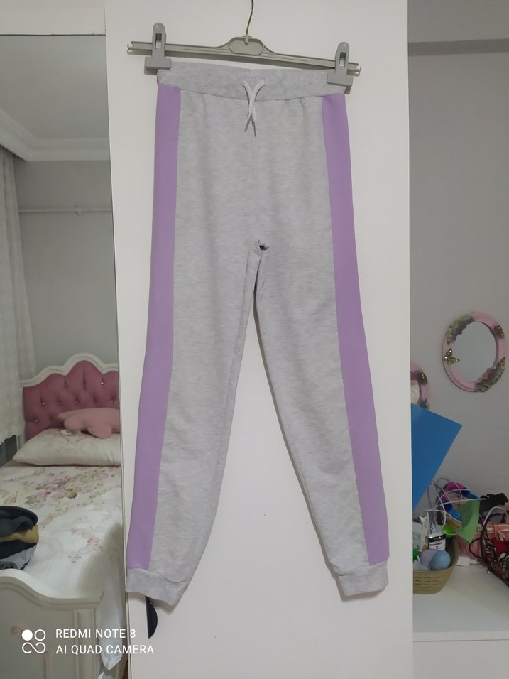 Normal boy, bol kesim ve elastik bel bantlı gri eşofman, mor yan şerit detaylarıyla rahat ve sıcak bir kumaştan üretilmiştir. Bir iki defa kullanıldı yeniden farkı yok Boyu 87cm Beli 67 cm
