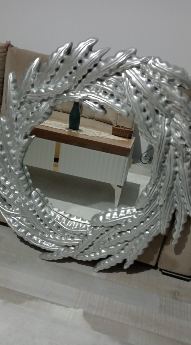 Gri yaprak desenli, dokulu detaylara sahip dekoratif çerçeve, mekana doğal bir dokunuş katar.