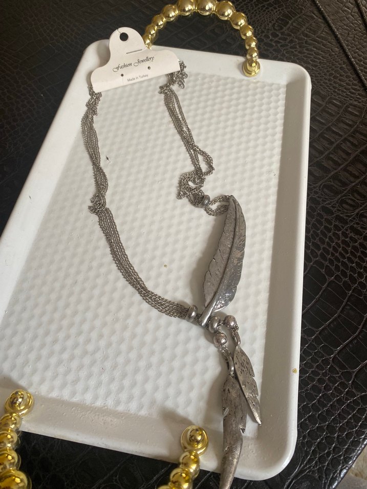 Gri renkte, yaprak deseni detaylı uzun zincir kolye, bohem tarzı yansıtıyor, günlük kullanıma uygundur.