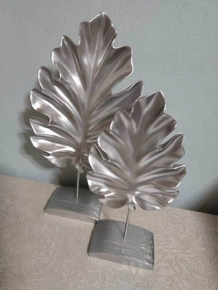 İki adet gri yaprak figür, dikdörtgen taban üzerinde duruyor ve modern bir dekoratif dokunuş sağlıyor.