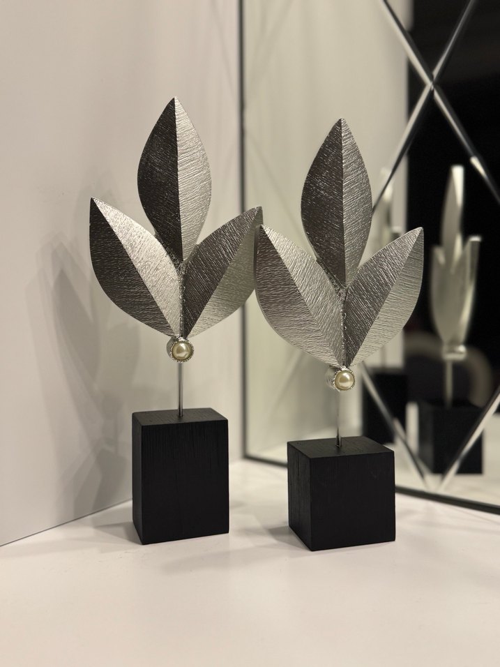 Dokulu yüzeye sahip gri yaprak figürleri, siyah kare kaideler üzerinde. Modern görünümlü dekoratif parçalar.