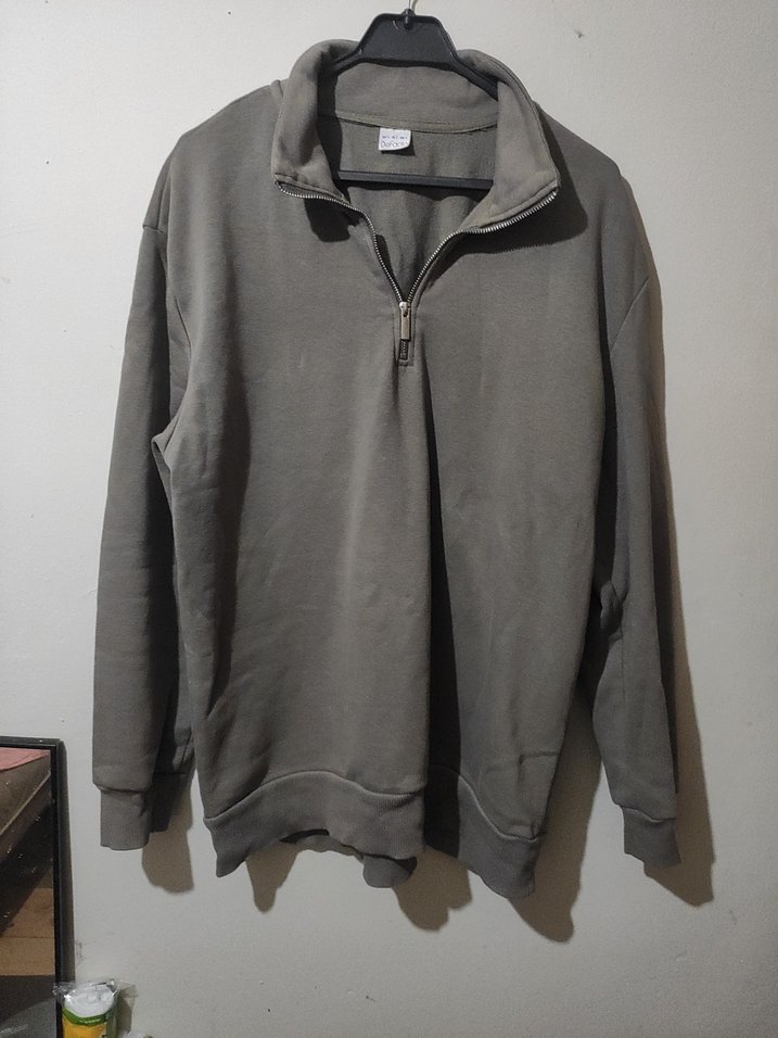 Yarım fermuarlı yüksek yakalı, uzun kollu, bol kesim gri erkek sweatshirt. Yumuşak ve sıcak kumaştan, gündelik kullanım için uygun.