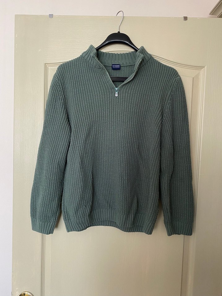 Gri renkte, yarım fermuarlı, uzun kollu ve bol kesim örme erkek kazak. Günlük kullanıma uygundur.