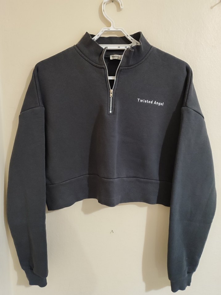 Yarım fermuarlı, yüksek yakalı ve uzun kollu gri sweatshirt, 'Twisted Angel' baskılıdır. Rahat ve sıcak bir kumaştan üretilmiştir.