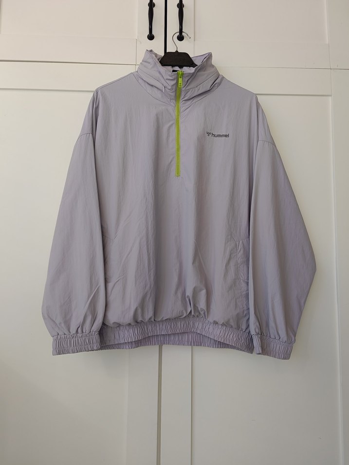 Gri renkte, uzun kollu ve yüksek yakalı kadın spor ceketi. Yarım fermuarlı ve bol kesim, sentetik kumaştan üretilmiştir, outdoor kullanım için uygundur.