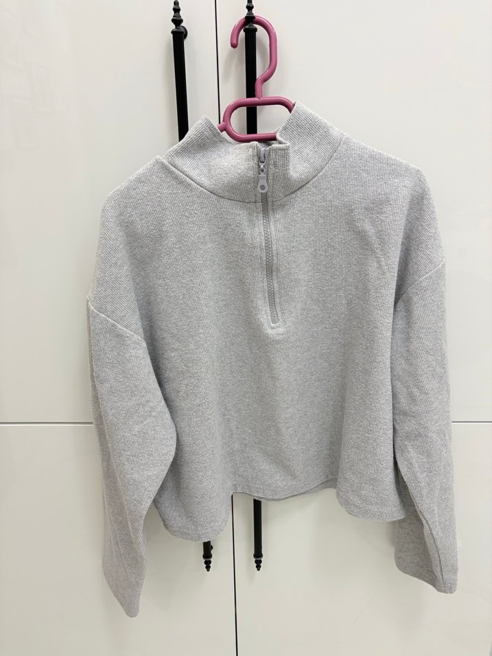 Yarım fermuarlı, yüksek yakalı, bol kesim gri sweatshirt. Uzun kollu ve yumuşak, sıcak tutan kumaştan üretilmiştir.