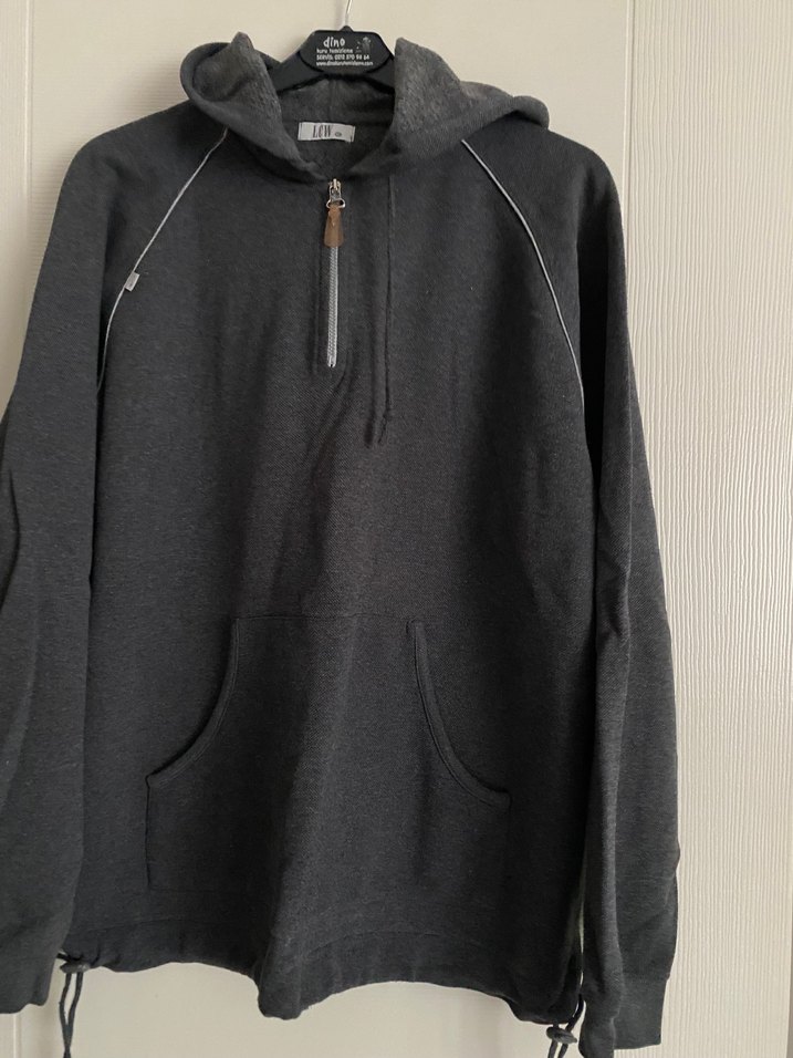 Gri renkte, yarım fermuarlı ve kapüşonlu uzun kollu erkek sweatshirtü. Rahat kesimi ve kanguru cebine sahip, günlük ve sokak stili için uygun.