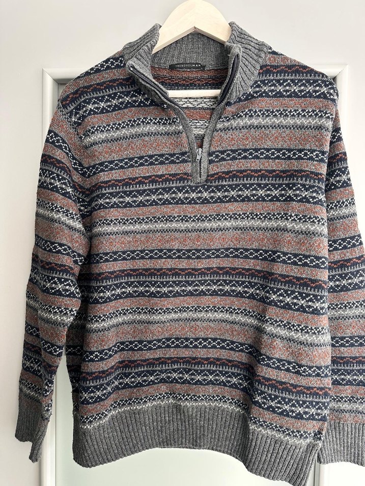 Bu erkek kazak, yarım fermuarlı yüksek yakaya ve uzun kollara sahip, örgü kumaştan ve bol kesimlidir. Gri tonlarında desenli, bohem tarzı sunar ve rahat kullanıma uygundur.