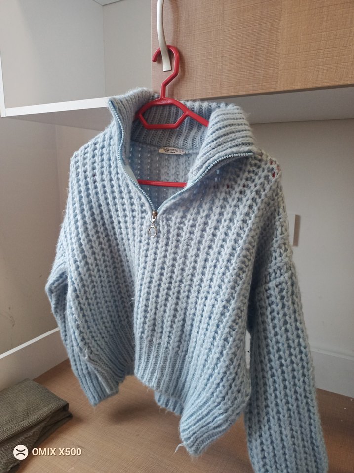 Gri renkte, örgü kadın kazak. Yarım fermuarlı yüksek yaka, bol kesim, uzun kollu ve midi boyda, günlük kullanıma uygun.