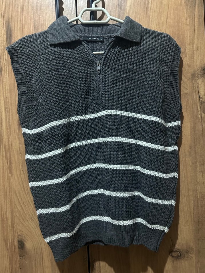 Gri renkli, yarım fermuarlı, örgü süveter. Yüksek yakalı, kolsuz ve yatay beyaz çizgili, rahat kesim ve midi boyda, günlük sokak stili için uygun.