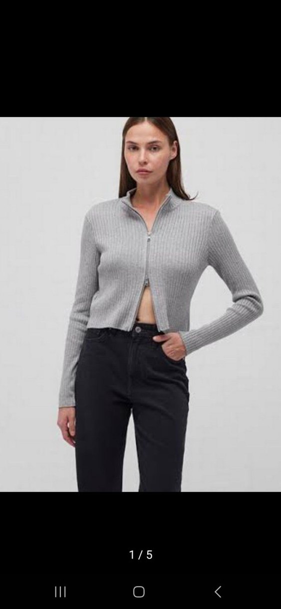 Gri, yüksek yakalı ve uzun kollu, yarım fermuarlı kadın kazak. Denim kumaştan, normal midi boyunda ve sokak modasına uygun. Mavi jeans hiç kullanılmamıştır etiketli gri dar üst