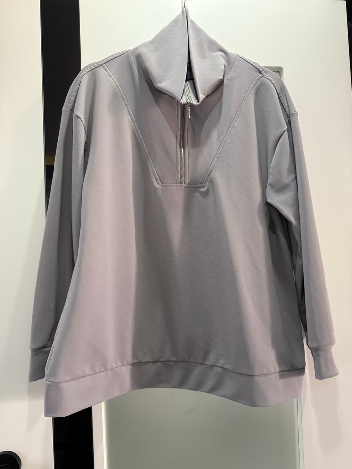Gri renkte, yüksek yakalı ve yarım fermuarlı sweatshirt. Uzun kollu, bol kesim Rahat sokak stili için uygundur.