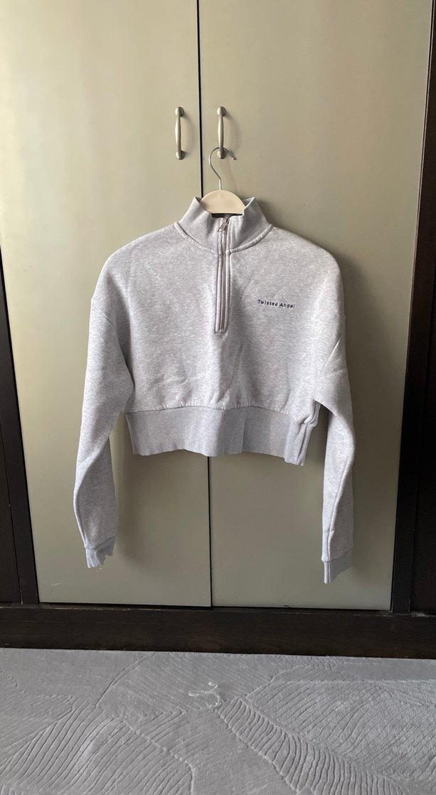 Gri renkli, yüksek yakalı ve yarım fermuarlı sweatshirt. Uzun kollu, bol kesim ve baskılı desenli, orta boy uzunlukta, yumuşak ve sıcak kumaştan üretilmiştir.