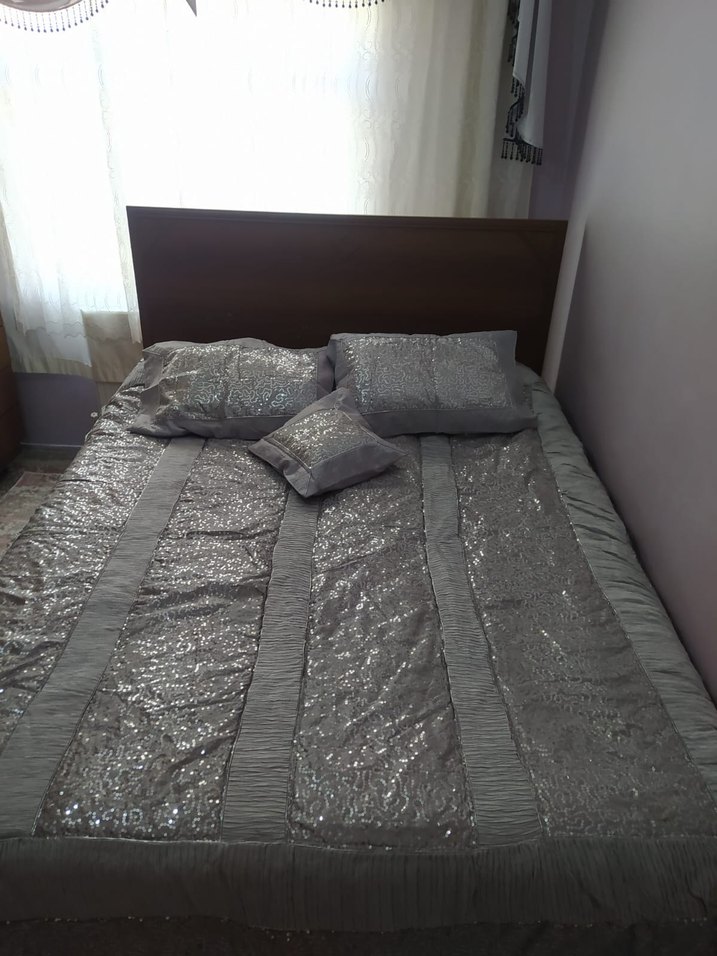Gri yatak örtüsü, payet detaylı desenleriyle dokulu ve şık bir görünüm sunar. Uyumu sağlamak için yastık kılıfları da dahildir. ️