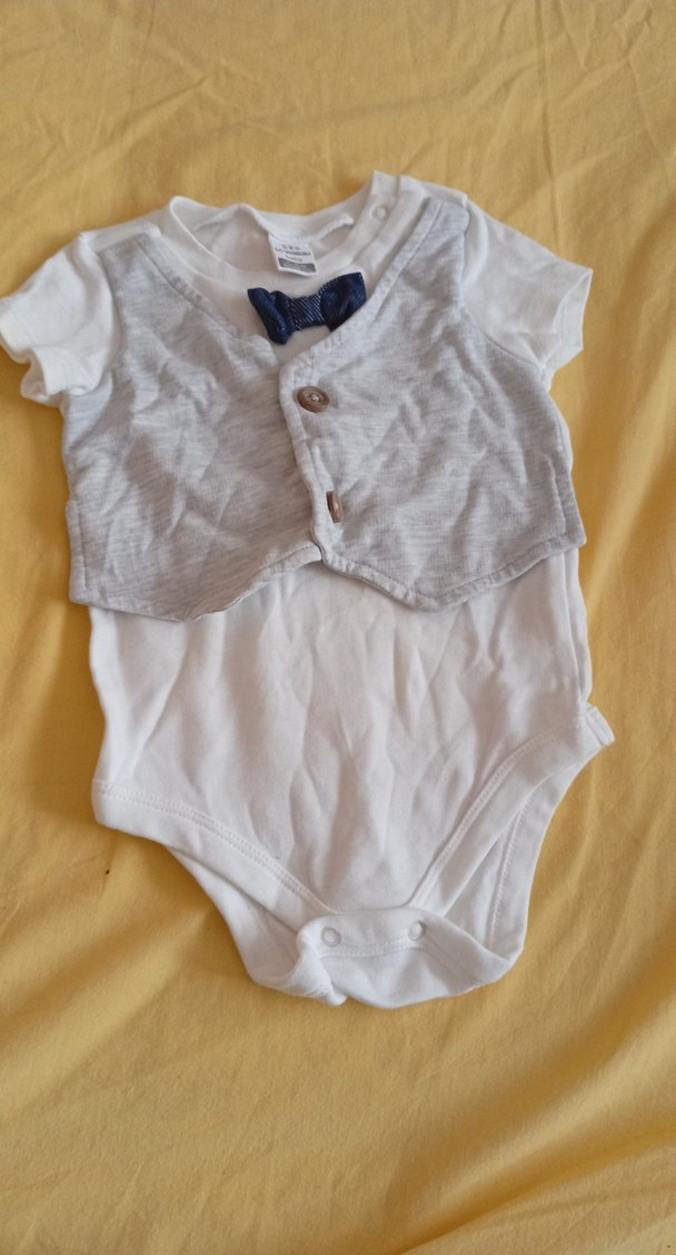 Beyaz pamuk kısa kollu bebek body, gri düğmeli yelek ve yakalı, küçük mavi papyon detaylı