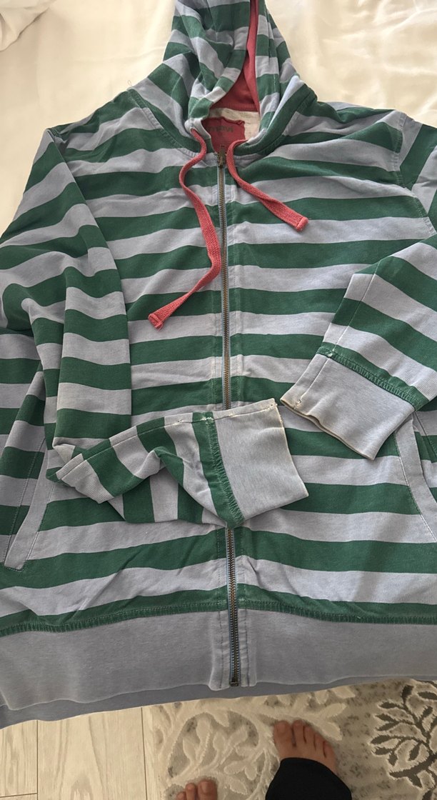 Gri-Yeşil Çizgili Kapüşonlu Fermuarlı hırka