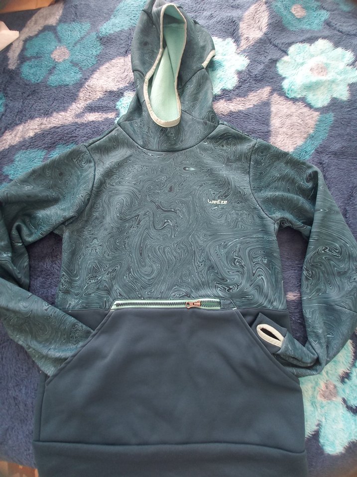 Gri yeşil renkte, bol kesim kadın sweatshirt. Yumuşak kumaştan, kapüşonlu ve fermuarlı ön cep bulunur. Uzun kollu, rahat ve şık sokak stili için uygundur.