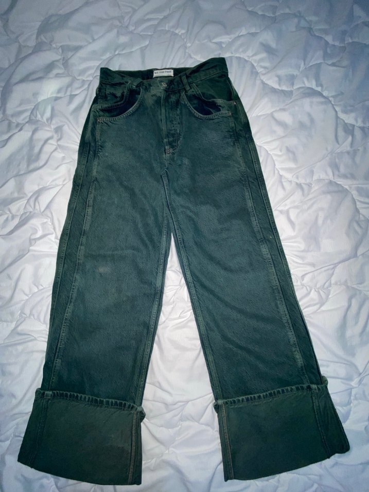 Gri-yeşil tonlarda, midi boy ve katlanmış paçalı loose fit denim kadın pantolon, günlük kullanıma uygun rahat ve sokak stili şıklığı sunar.