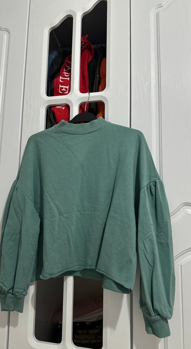 Gri-yeşil renkte, uzun kollu ve yuvarlak yakalı, rahat kesim sweatshirt. Yumuşak ve sıcak kumaştan günlük kullanım için uygundur.