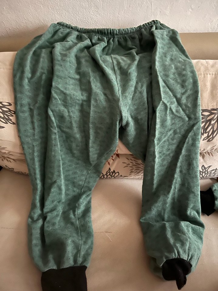 Erkek pijama takımı, bol kesim, uzun kollu ve boğazlıdır. Dökümlü tasarımıyla rahat ve sade bir tarz sunar, gri-yeşil tonlarda.