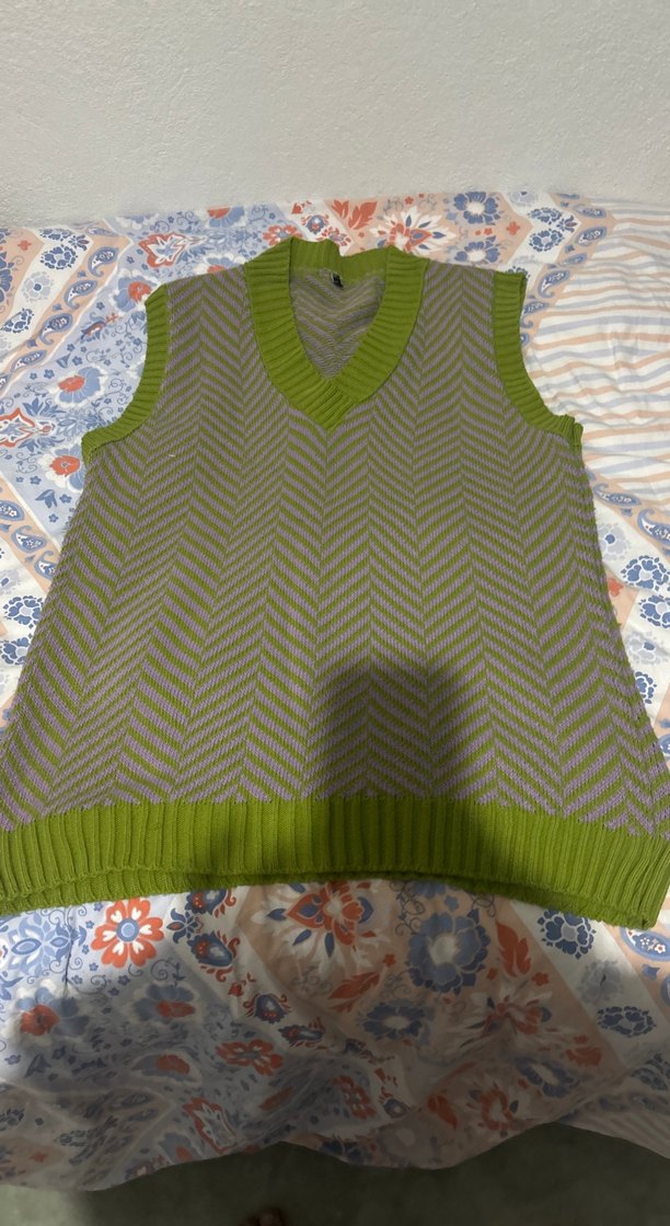 Yeşil ve gri renklerde, V yaka, örgü, kolsuz ve bol kesim süveter. Günlük rahat ve sokak stiline uygun.