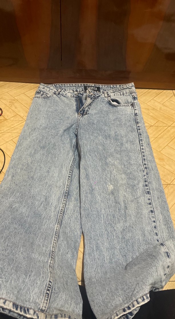 Düğmeli, bol kesim kadın midi kot pantolon. Gri yıkamalı mavi renk, günlük sokak stili için uygun.