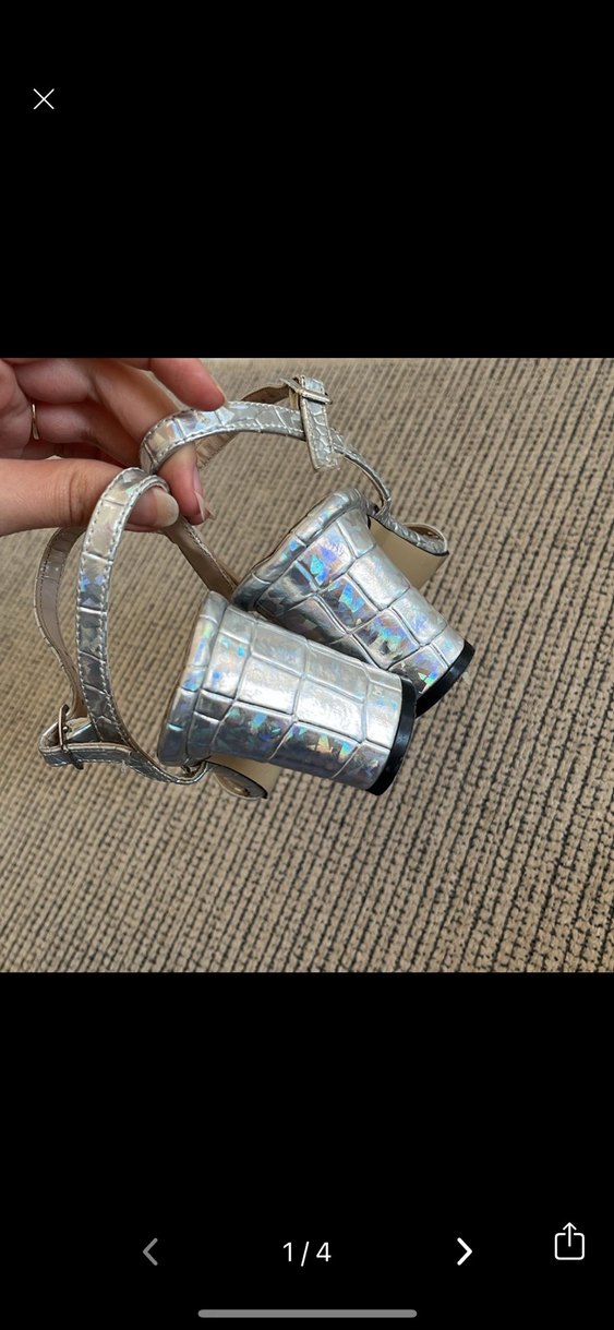 Gri yılan baskılı, tokalı kayışlı blok topuklu kadın ayakkabısı. Metalik görünümlü, çağdaş parti stilleri için uygundur.