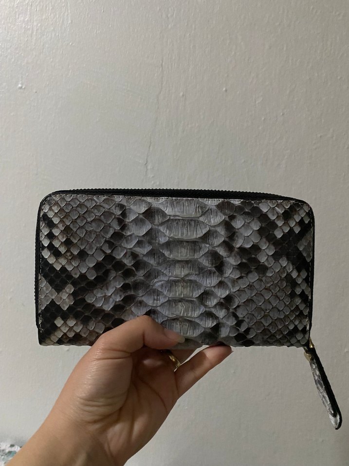 Gri yılan derisi desenli deri kadın cüzdanı, fermuarlı kapanışıyla hem şık hem kullanışlı bir tasarım sunar.