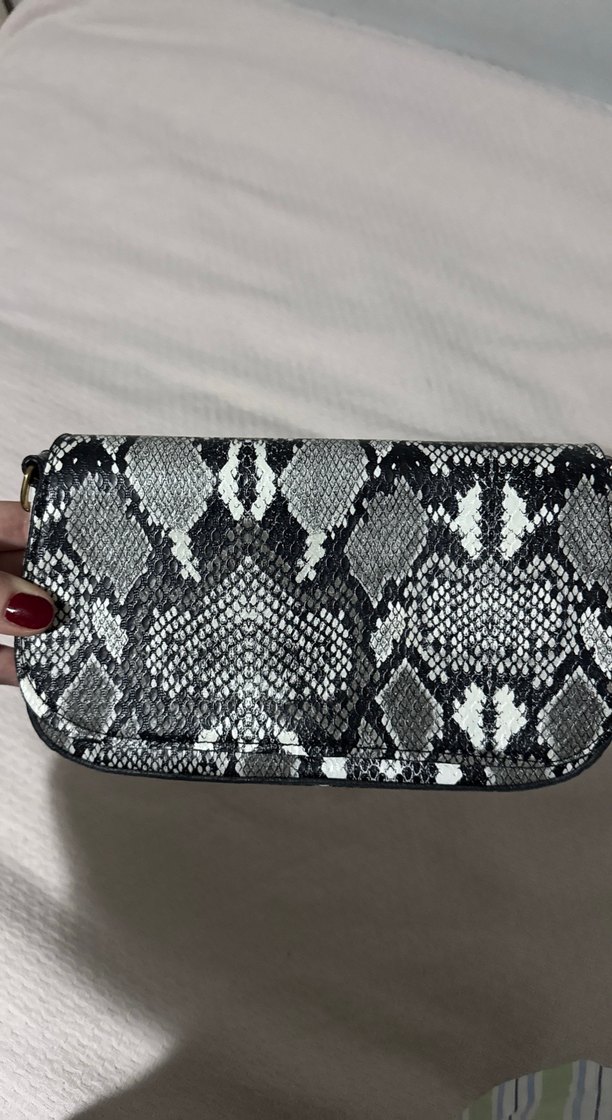 Gri yılan derisi desenli deri çanta, fermuarlı kapama ve Paris sokak modası ile bohem tarzı bir araya getiriyor.