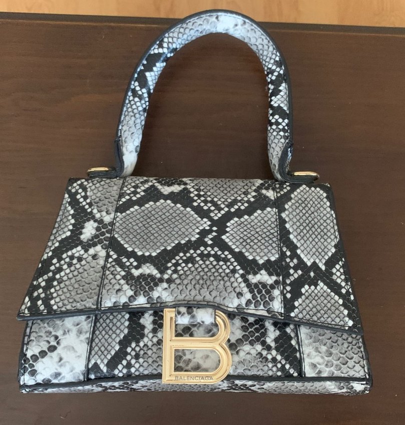 Gri yılan derisi desenli, tokalı kadın deri çanta. Sokak modasına uygun, günlük kullanım için idealdir.