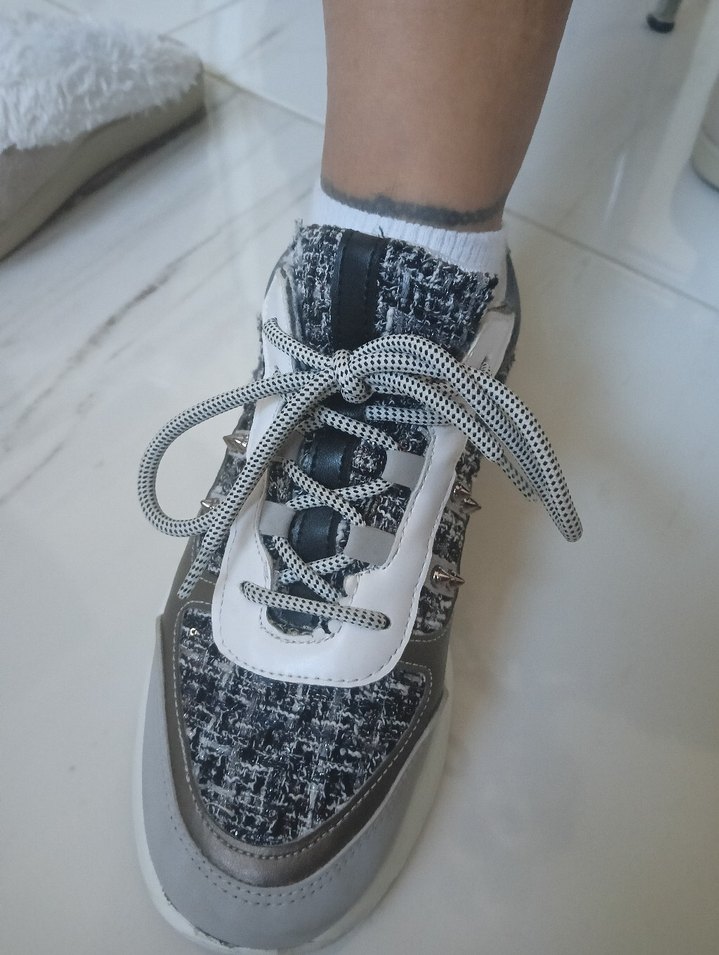 Gri yılan desenli, bağcıklı kadın spor ayakkabısı. Blok topuk ve kauçuk tabanlı, günlük sokak stili için uygun.son fotoda belirttim bir zımbası eksik ama belli olmuyor