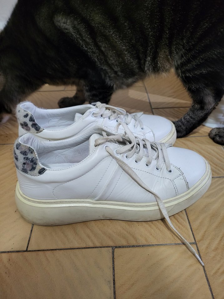 Gri yılan desenli topuk kısmı ve bağcıklı tasarımıyla beyaz kadın spor ayakkabısı. Günlük kullanıma uygun, kauçuk tabanlı. Sararan taban beyaz spor ayakkabı boyasıyla yeni gibi olur.