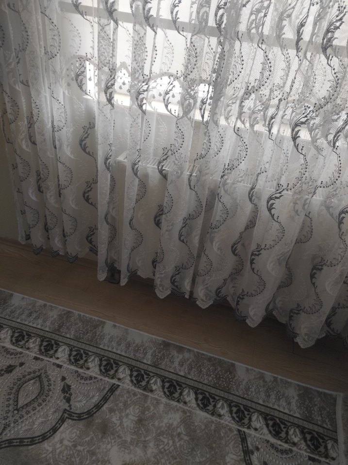 Gri yılan desenli beyaz perde, konvansiyonel tarzda ve zarif dokusuyla pencere dekorasyonuna uygun.