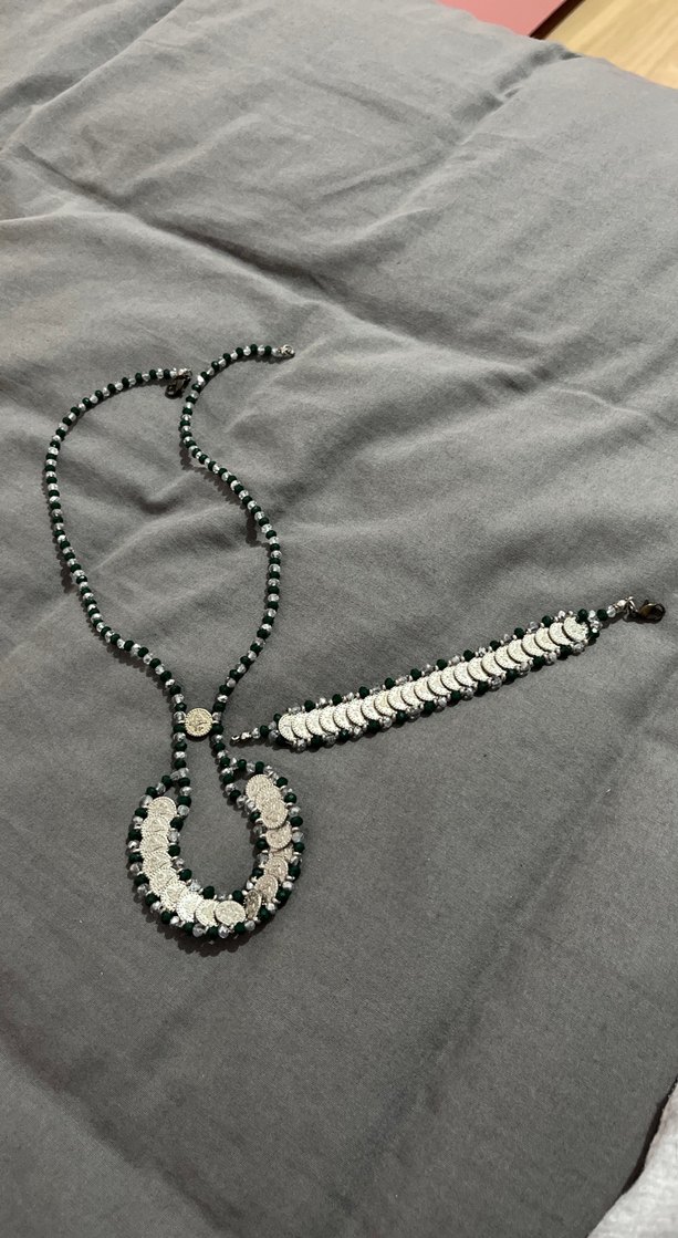 Bu uzun gri kolye, boncuk detayları ve yılan desenli deseniyle günlük kullanım için bohem ve avangart bir tarz sunar. El emeği