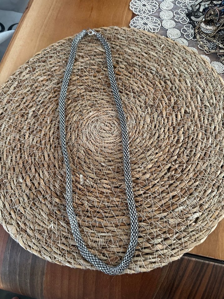 Gri yılan desenli boncuklarla yapılmış uzun kadın kolyesi, bohem ve retro tarzı yansıtarak günlük kullanıma uygundur.