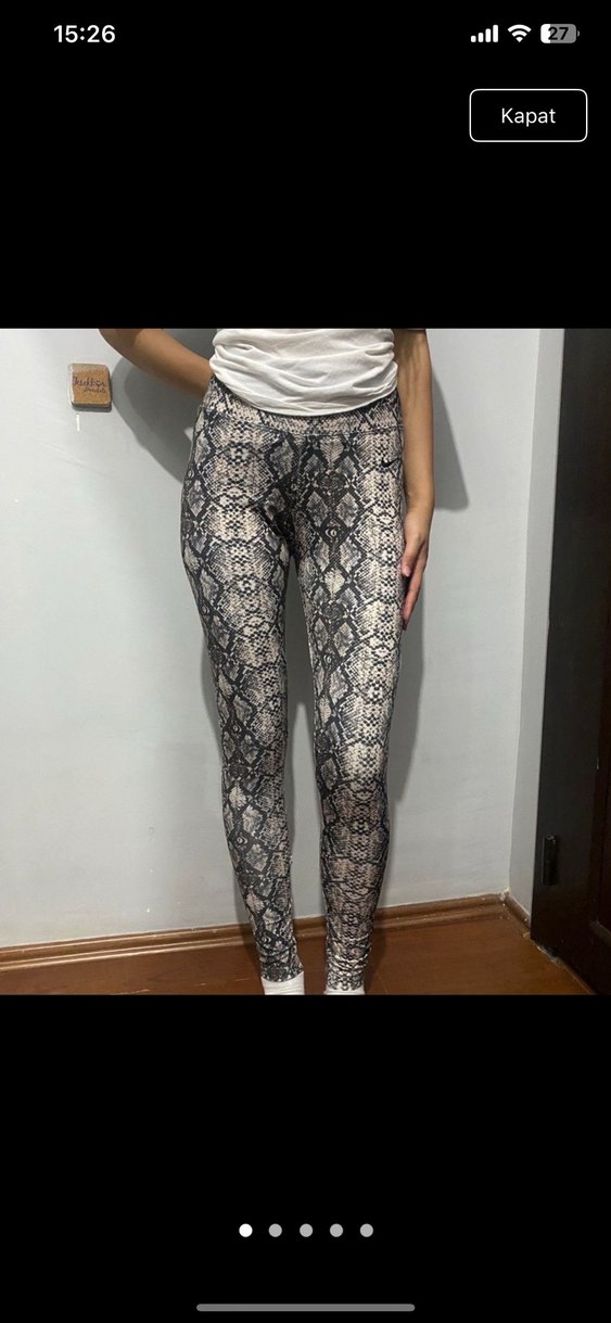 Gri yılan desenli, dantel detaylı, sentetik kumaştan yapılmış, günlük kullanıma uygun kadın tayt.