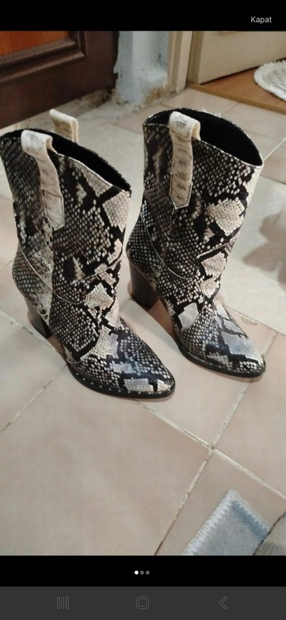 Gri yılan desenli deri kadın botları, blok topuklu ve tokalı detaylara sahip. Sokak stili ve günlük kullanım için uygun.