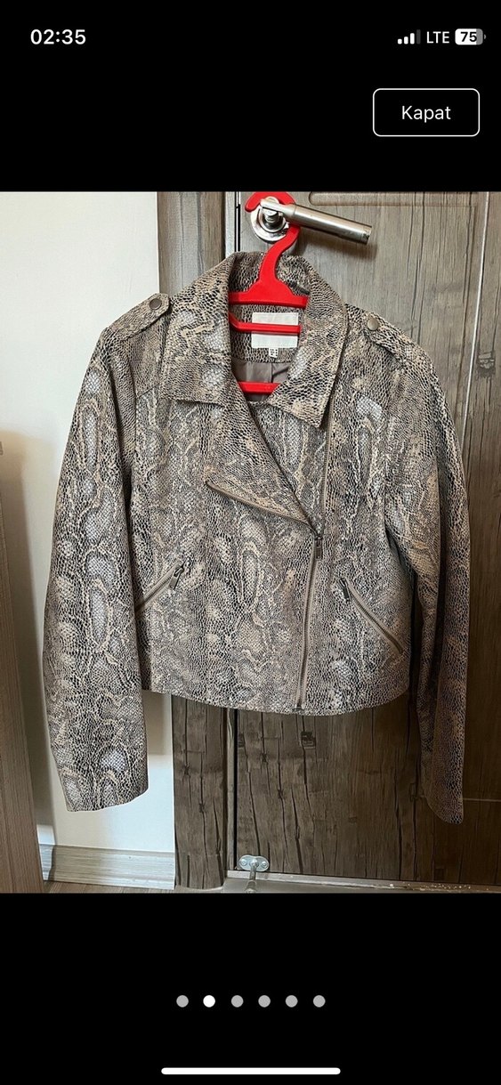 Gri yılan desenli, fitted kesim deri kadın ceket. Uzun kollu, çıtçıtlı yakalı ve fermuarlı, normal boyda, sokak modasına uygun.