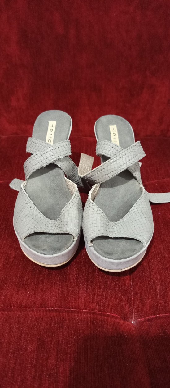 Yılan desenli ve süet malzemeden yapılmış gri dolgu topuklu kadın sandaletleri. Tokalı kayışlarıyla rahat ve minimalist bir tarza sahiptir.