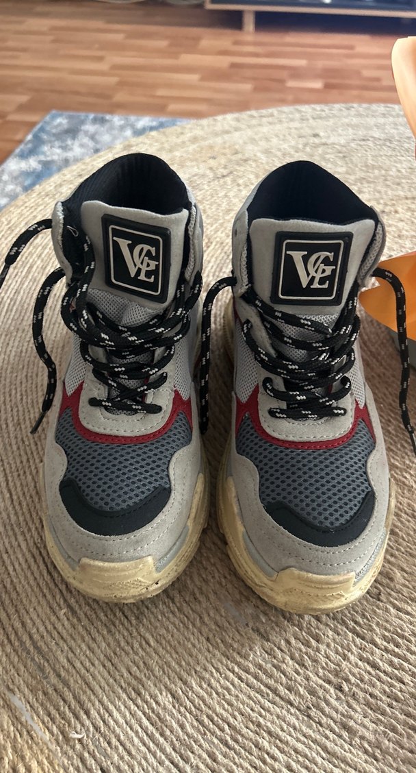 Gri yılan desenli, dolgu topuklu spor ayakkabı. Kaymaz tabanlı, cırt cırtlı ve rahat sokak stili için uygundur.