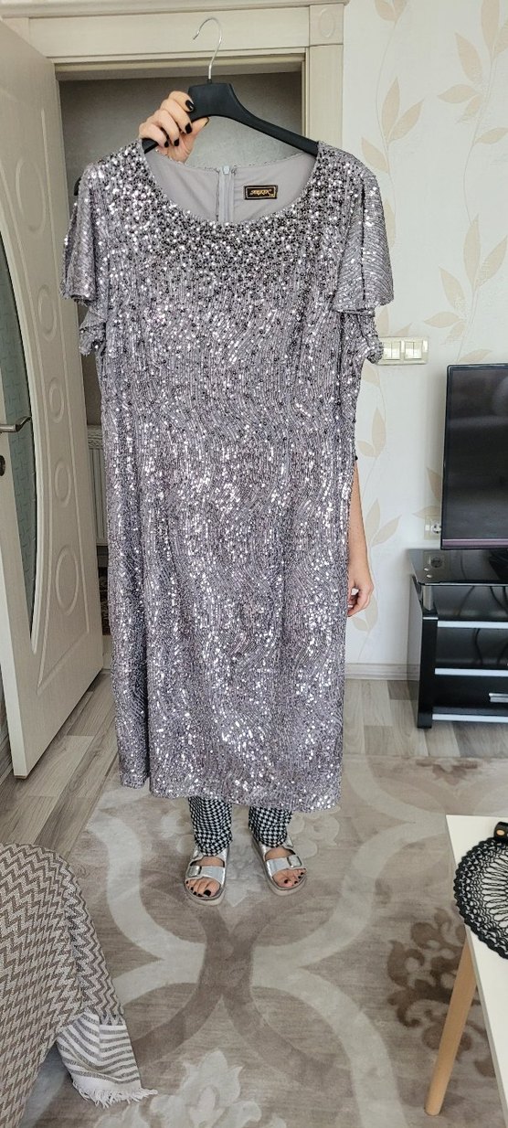 Gri yılan desenli, drapeli uzun elbise, salaş kesim, tekne yaka ve kısa kolludur. Parti için çağdaş ve göz alıcı bir tarz sunar.