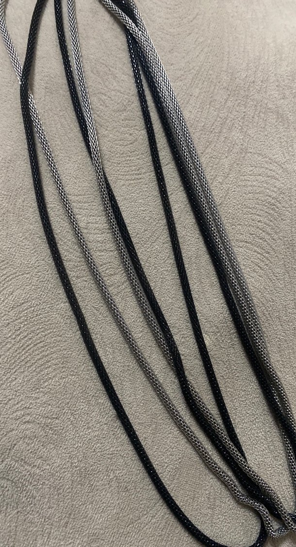 Günlük kullanıma uygun, gri yılan desenli, elastik özellikli uzun kadın kolyesi, çağdaş avant-garde tarzında tasarlanmıştır.
