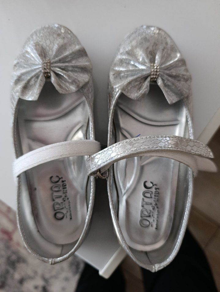 Modern klasik stil, yılan desenli gri kız babetleri, önde fiyonk detaylı. Yumuşak kauçuk tabanlı, kayışlı tasarım. Bir defa giyildi